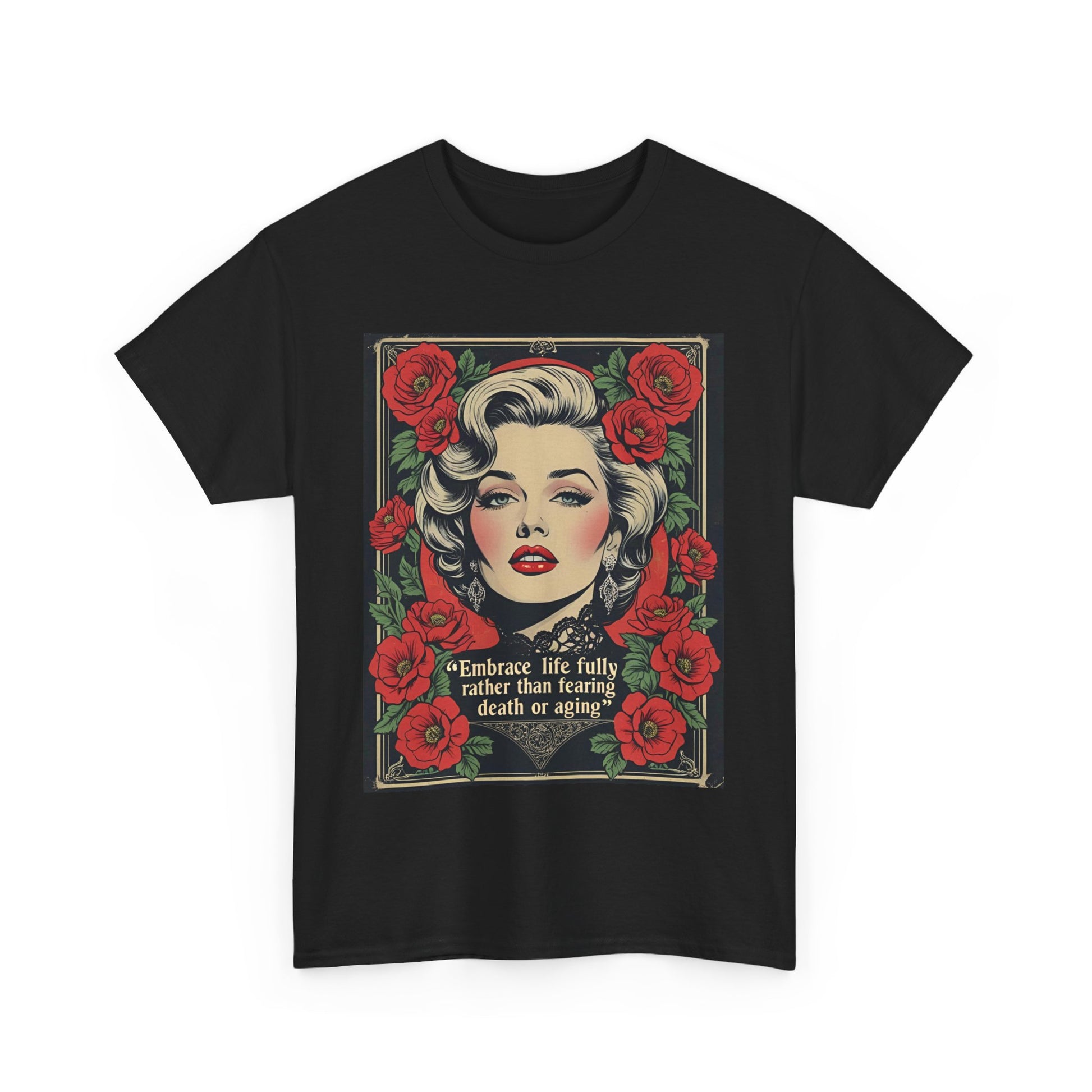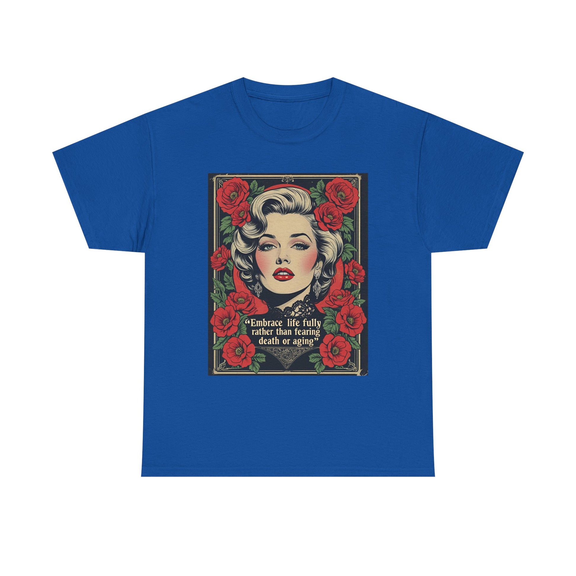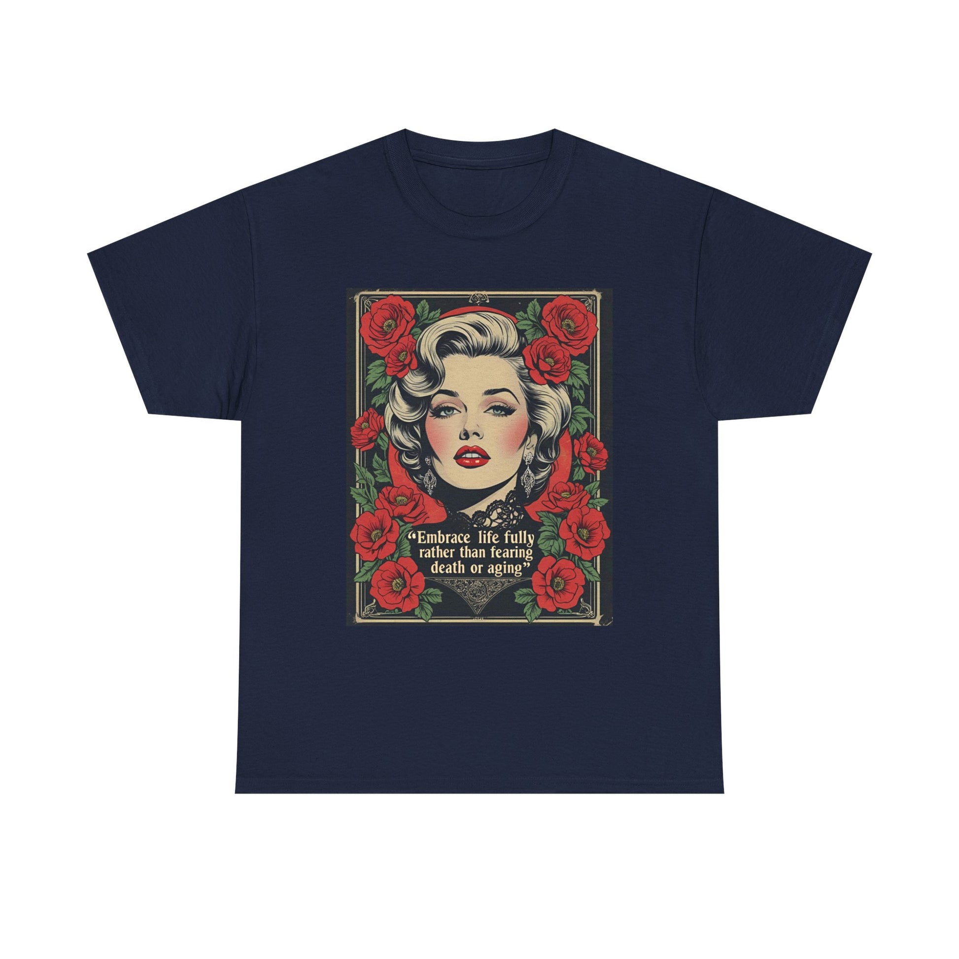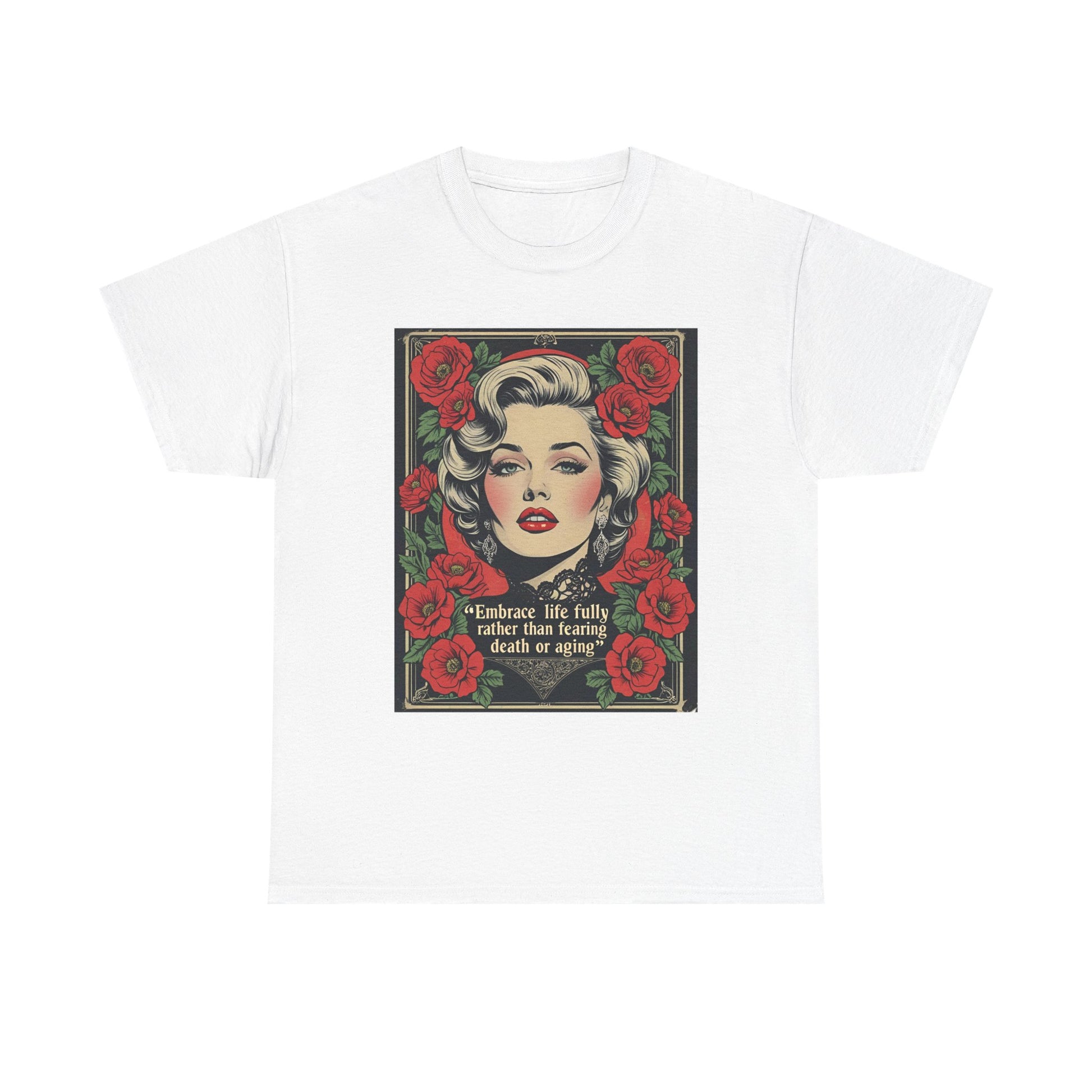 An elegant Day of the Dead design featuring a Monroe quote and elegant roses, giving off a bold and stylish vibe. Perfect for those who appreciate unique and eye-catching graphics. Ideal for Day of the Dead celebrations and fans of vintage Hollywood glamour.