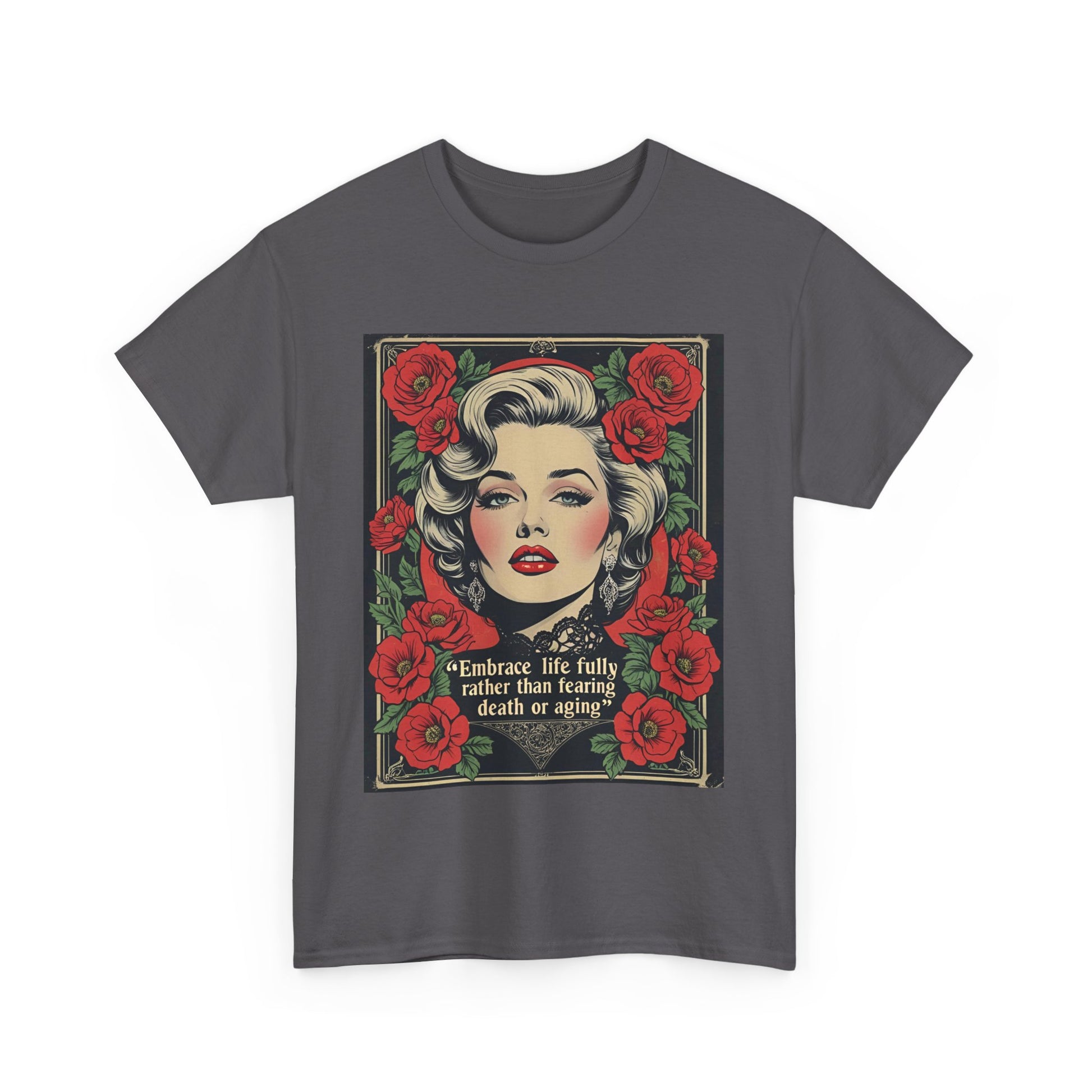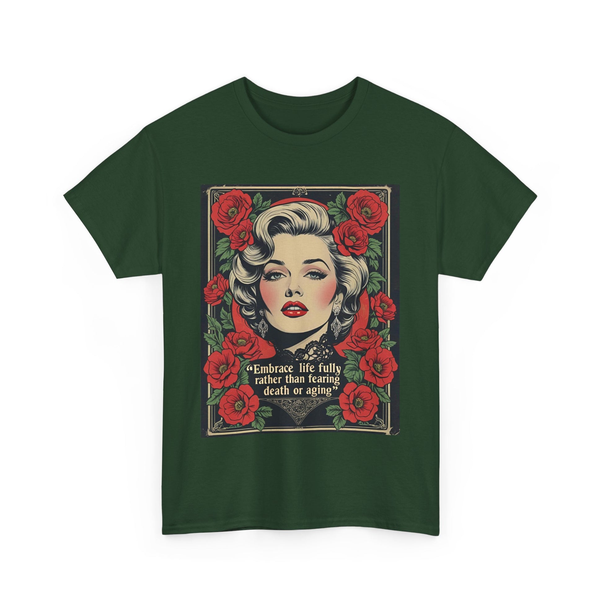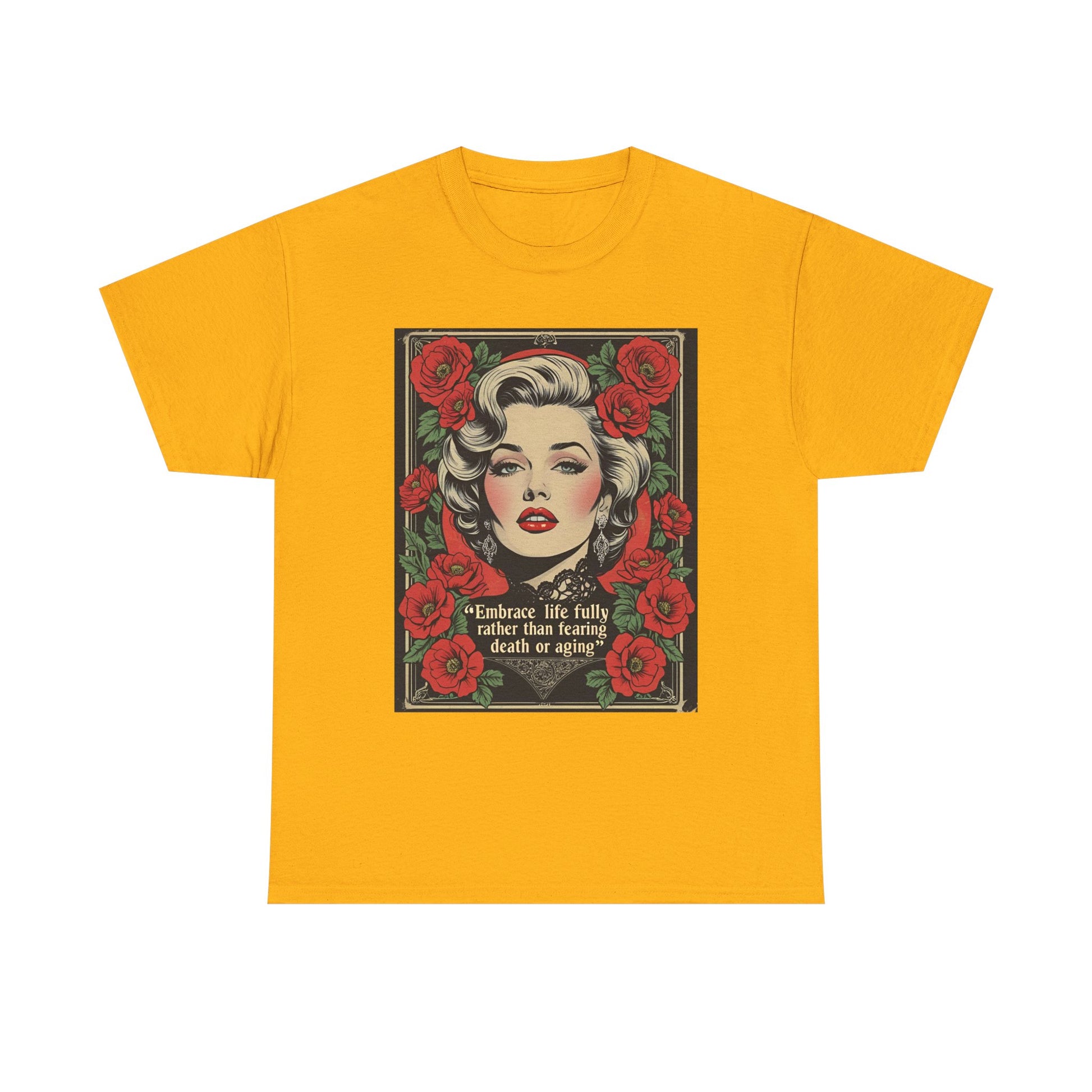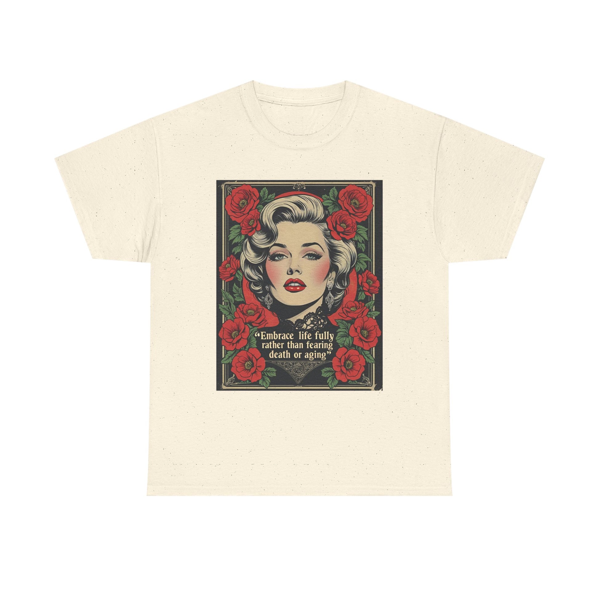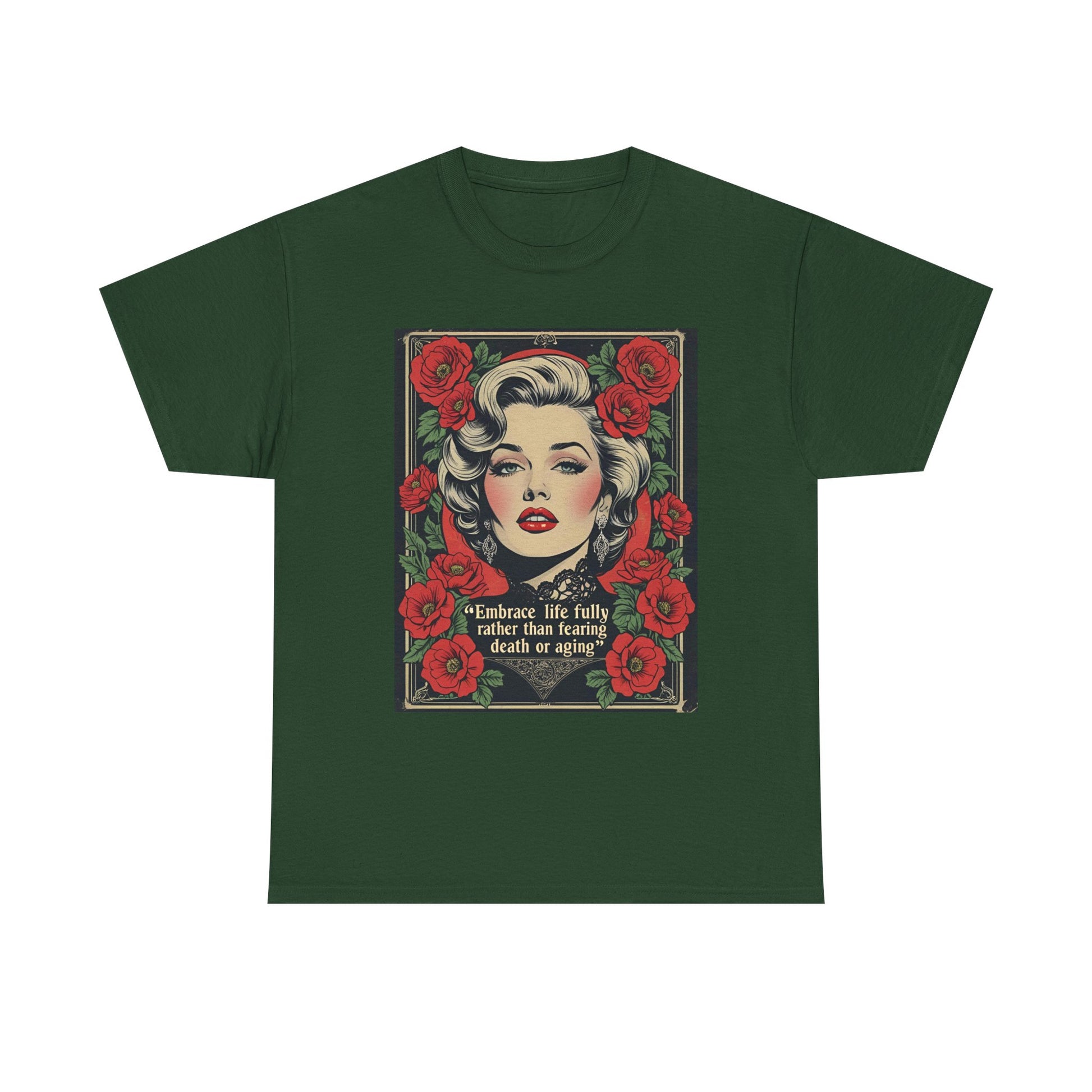 An elegant Day of the Dead design featuring a Monroe quote and elegant roses, giving off a bold and stylish vibe. Perfect for those who appreciate unique and eye-catching graphics. Ideal for Day of the Dead celebrations and fans of vintage Hollywood glamour.