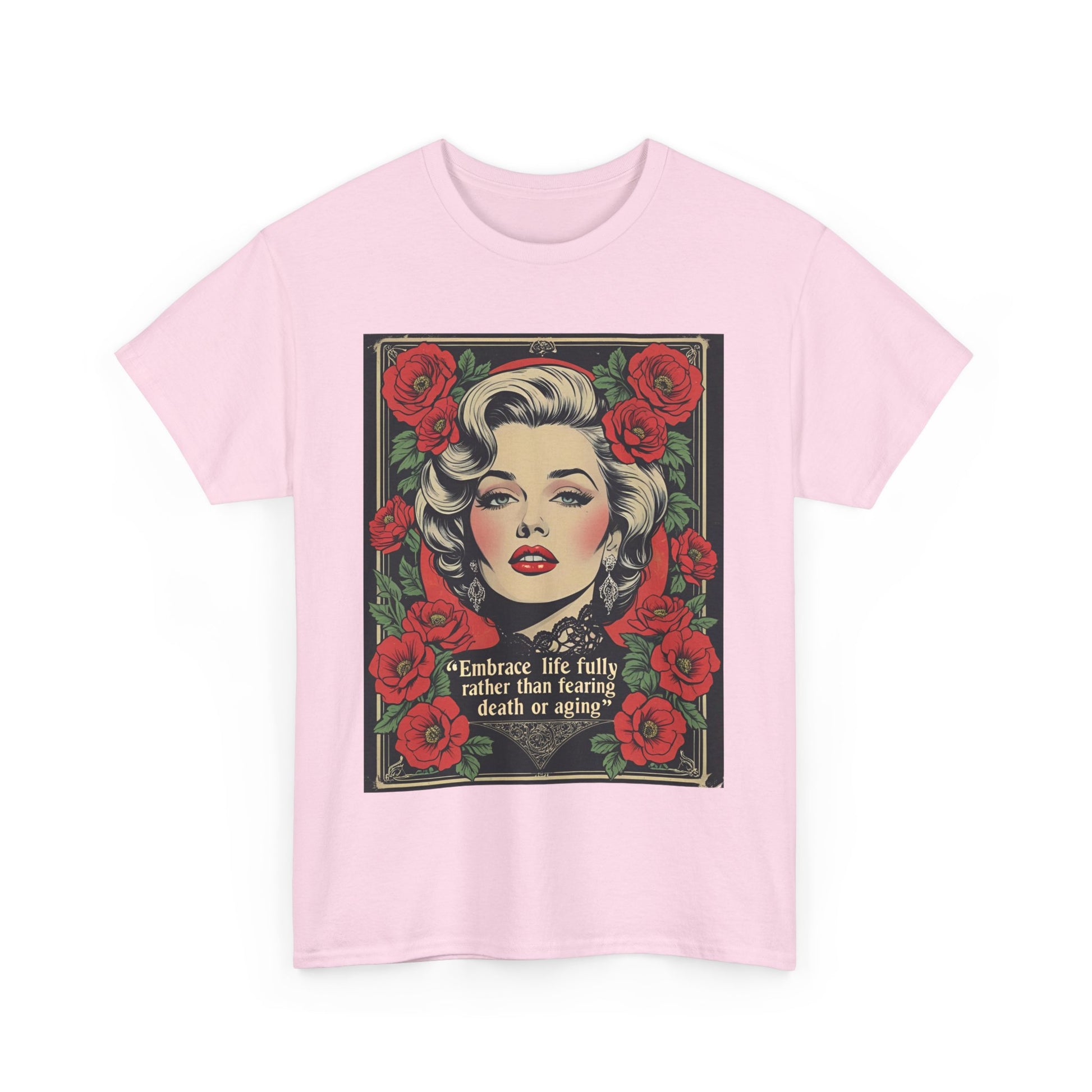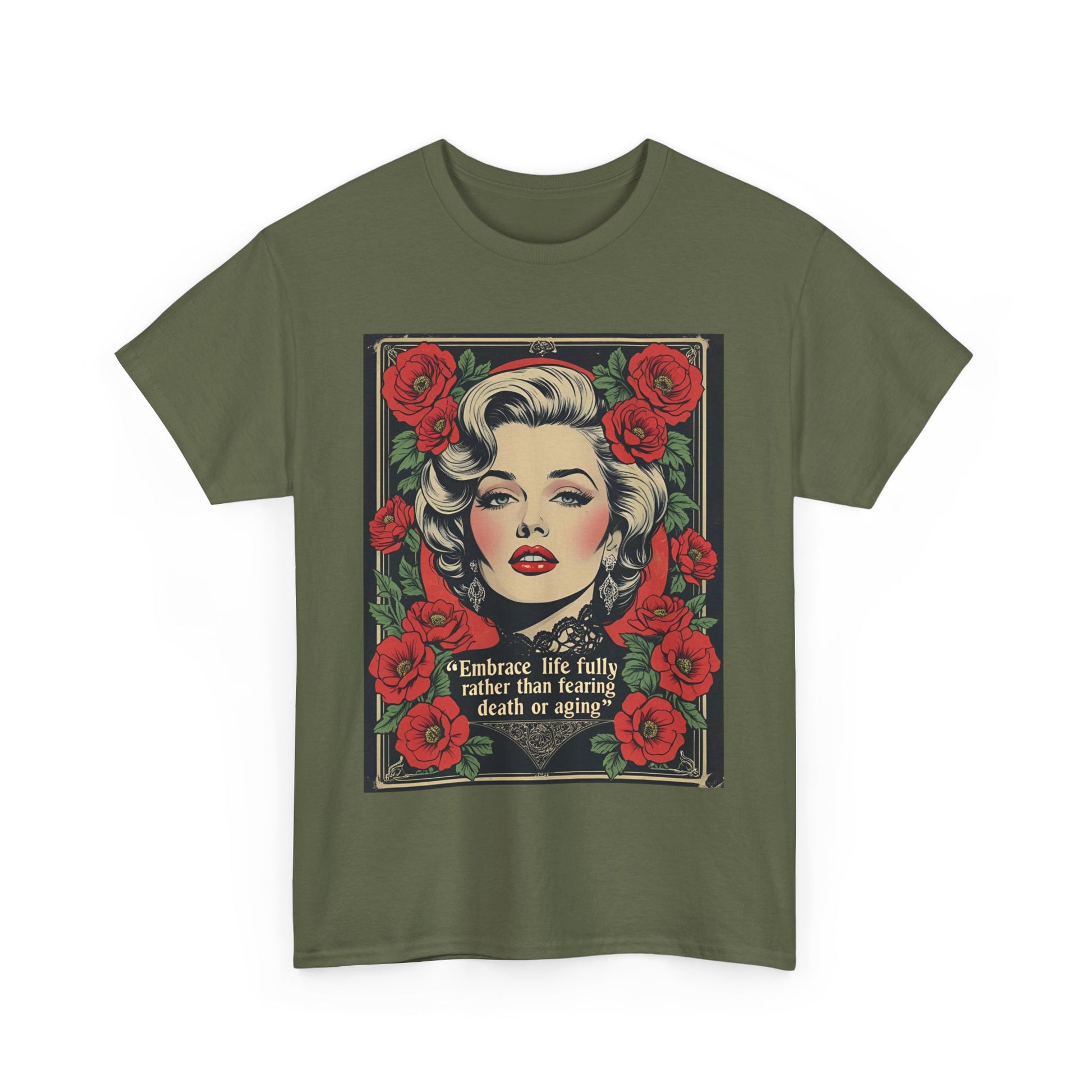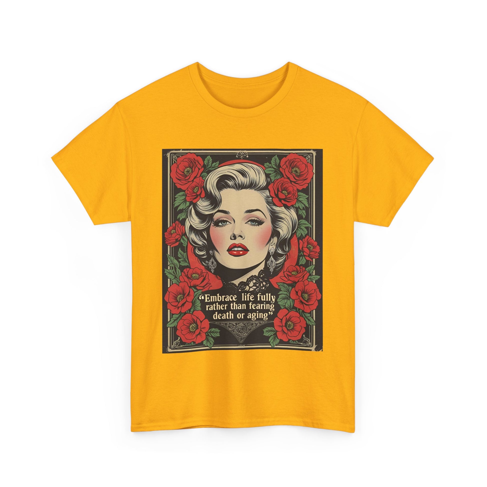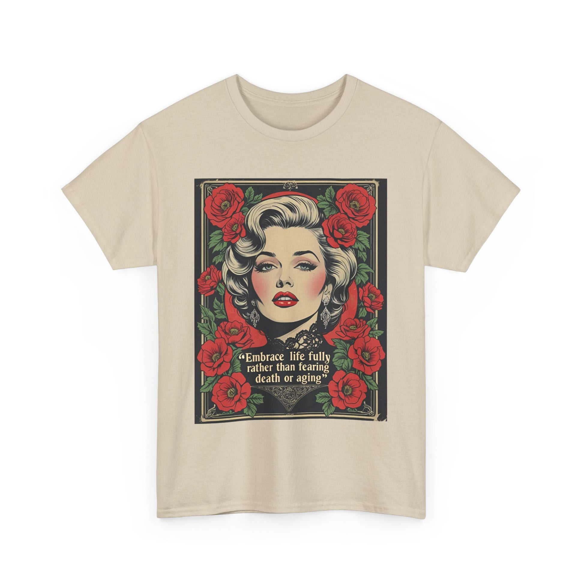 An elegant Day of the Dead design featuring a Monroe quote and elegant roses, giving off a bold and stylish vibe. Perfect for those who appreciate unique and eye-catching graphics. Ideal for Day of the Dead celebrations and fans of vintage Hollywood glamour.